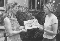 | Hilfe in der „Not” bot der Scheck des Wirtschaftskreises Müggelheim. Beim diesjährigen Angerfest kam am WKM-Stand durch den Dreh am Glücksrad eine Summe von 654,- DM zusammen, die dem Kindergarten für die Außenanlagen gestiftet wurde. Der „Dreh für einen guten Zweck” hat inzwischen Tradition. Im vergangenen Jahr flossen 300,- DM an den Jugendclub Mügge, jetzt ging mehr als das doppelte an die Kita. Mutter Babett Thomson nahm das Geld stellvertretend für alle von der WKM-Vorsitzenden Angela Draffehn entgegen. „Wünsche haben wir noch viele für unsere Kinder, beispielsweise einen Wasserpilz oder auch einen Carport für die ganzen Kinderfahrzeuge“, sagt sie und bedankte sich im Namen aller anderen Eltern und Kinder. Foto: Jacobius |