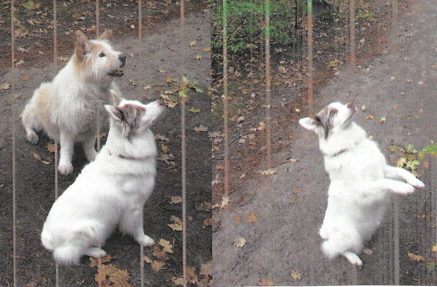 Patches beim Leckerli-Fangen, während Trabbi begeistert zuschaut. Und rechts zeigtPatches seine Zirkus-Kunststücke.